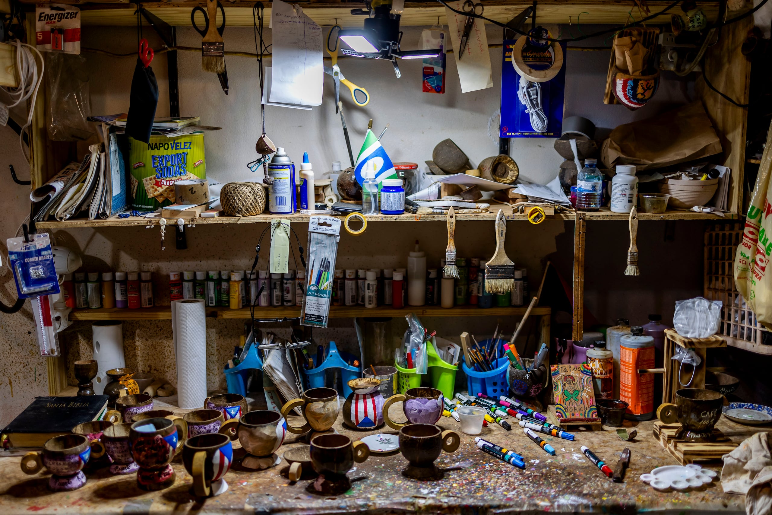 Allí acomoda la materia prima que más tarde se convertirá en antiguos utensilios de cocina confeccionados en coco e higüera, entre estos, cucharones, vasijas, tazas y cafeteras. Mientras tanto, su esposa, Adelaida Troche Rivera, lo llama cariñosamente para darle un buchito de café.