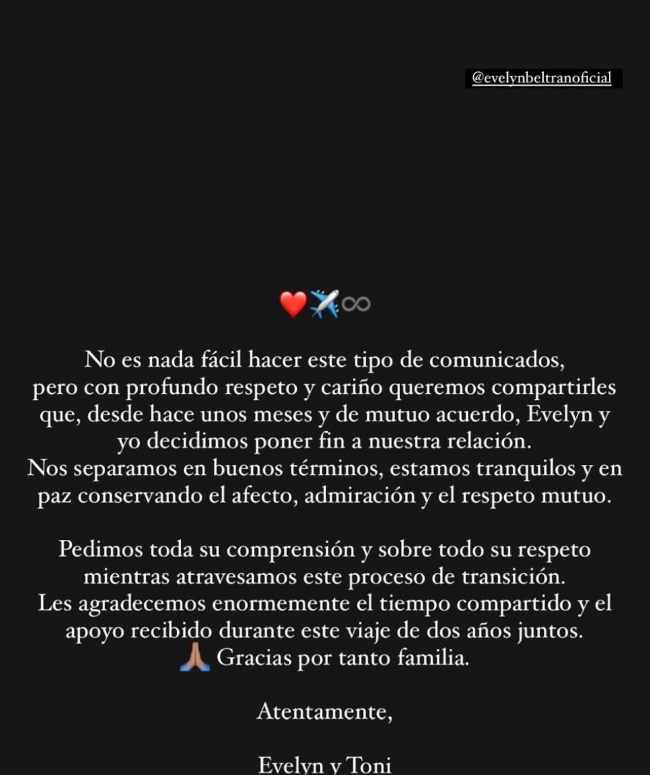 “No es nada fácil hacer este tipo de comunicados, pero con profundo respeto y cariño queremos compartirles que, desde hace unos meses y de mutuo acuerdo, Evelyn/Toni y yo decidimos poner fin a nuestra relación. Nos separamos en buenos términos, estamos tranquilos y en paz conservando el afecto, admiración y el respeto mutuo”, manifestó la pareja en un mensaje colocado en el carrusel de stories de sus cuentas de Instagram.