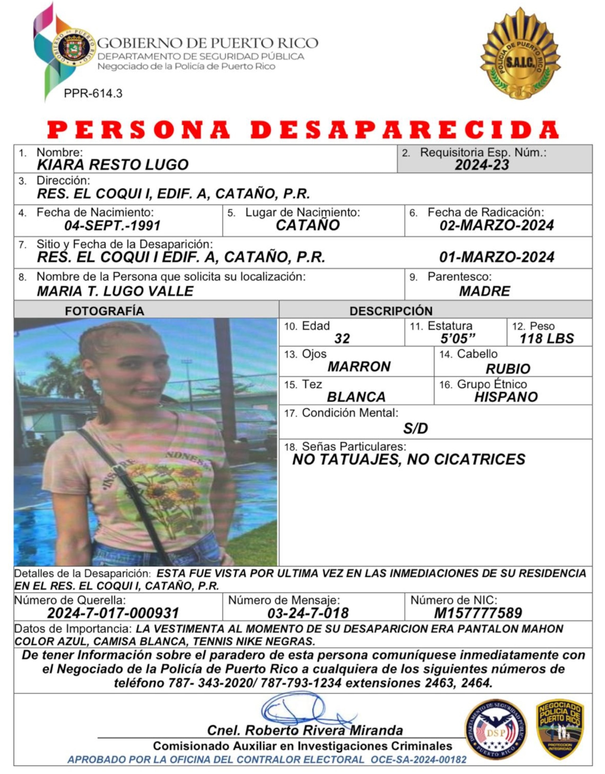 El comisionado del Negociado de la Policía, Antonio López Figueroa, ordenó la desactivación de la alerta Ashanti luego de que Kiara Resto Lugo, quien fuera reportada como desaparecida en Cataño, llegara a un cuartel de la Policía en compañía de otra persona.